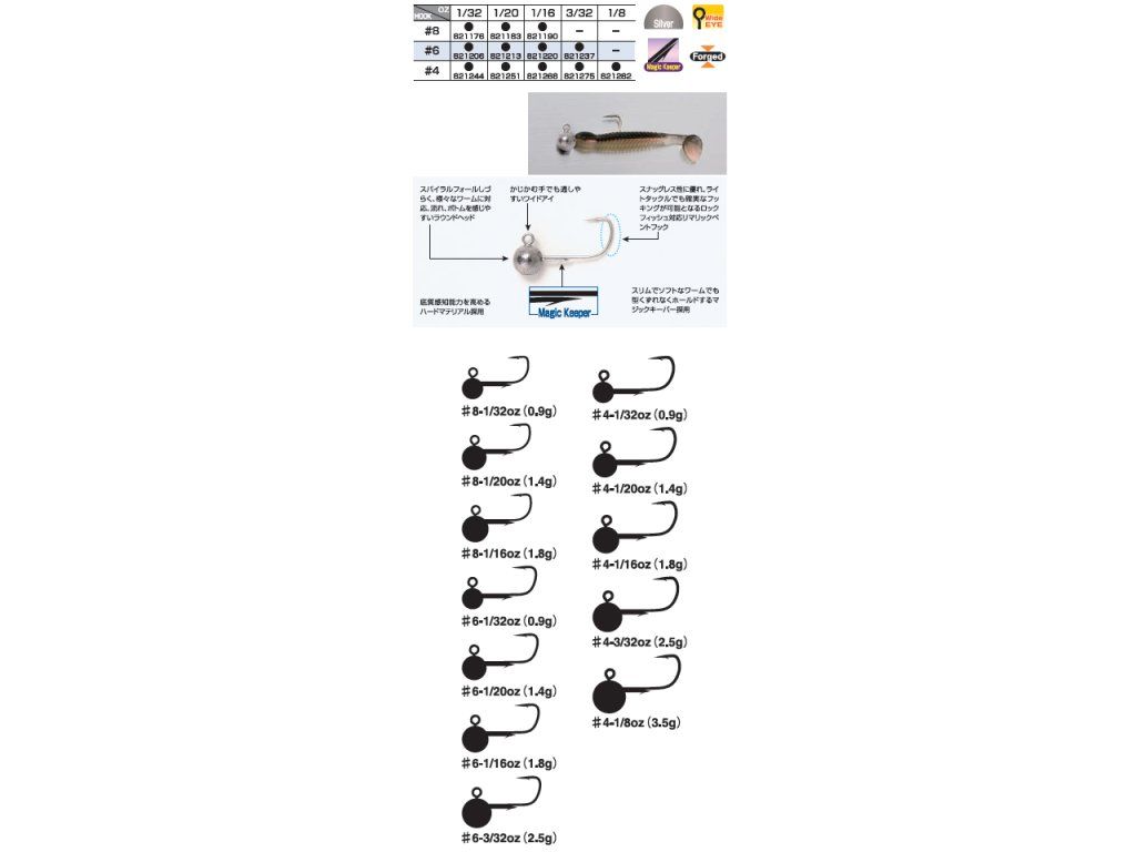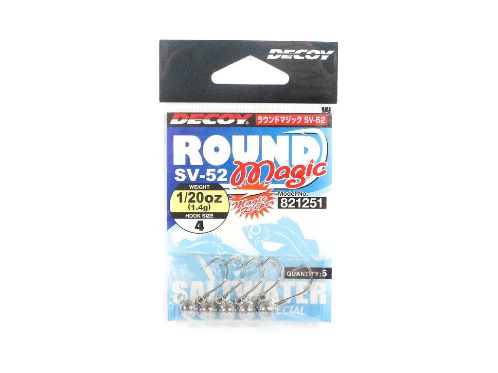 Klasické kulaté Jigové hlavičky UL a L třídy. Vhodné pro silikonové nástrahy ve velikostech od 1 do 3 palců. Odolný hák z tenkého drátu, záchytný systémek dobře držící a neškodící silikonové nástraze. Zvýšená velikost očka pro pohodlné, bezproblémové zapnutí karabinky. Různé velikosti háčků při stejné hmotnosti hlaviček pro odpovídající velikost nástrah při různých podmínkách lovu. Jigová hlavička Decoy Round Magic SSV-52 možňuje přívlač s aktivními i pasivními nástrahami. Mohou být použity ve sladké i slané vodě. Mocná zbraň pro milovníky UL přívlače.