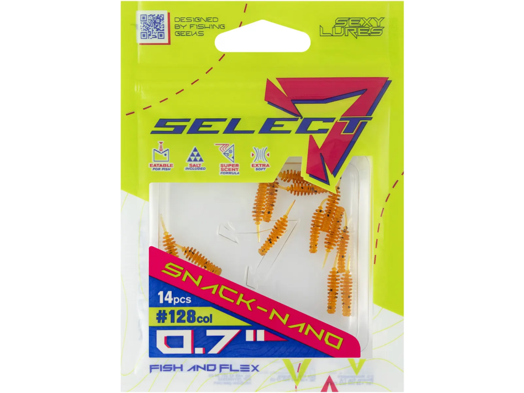 Select Snack to imitacja pulchnego robaka z obszernym, głęboko żebrowanym korpusem - jest to bardzo łakomy kąsek dla wielu gatunków ryb.Dzięki dużej liczbie segmentów Snack charakteryzuje się bardzo realistyczną pracą. Cechą charakterystyczną tej konstrukcji jest to, że pęcherzyki powietrza są uwięzione w głębokich żebrach, a podczas pozostawienia przynęty na dnie unoszą jej ogon niemal pionowo w górę.Najskuteczniejszym sposobem zbrojenia Snacka jest pojedynczy hak, standardowy lub offsetowy. Można również użyć stosunkowo krótkiej, podwójnej kotwiczki, najlepiej wykonanej z cienkiego drutu, aby swoją masą w jak najmniejszy sposób zakłócała pracę przynęty. Przód przynęty jest dość szeroki, co pozwala jej pewnie trzymać się na haczyku i zapobiega ześlizgiwaniu się Snacka podczas brania.Select Snack świetnie sprawdza się podczas łowienia okoni, pstrągów oraz sandaczy, a najmniejsze wersje tej przynęty doskonale prowokują do brań wzdręgi, płocie oraz wiele innych gatunków białorybu.Szczególnie polecamy łowienie na Snacka z czeburaszką lub jig rigiem, ale jest on także zabójczo skuteczny z takimi zestawami jak drop-shot, boczny trok oraz carolina rig.